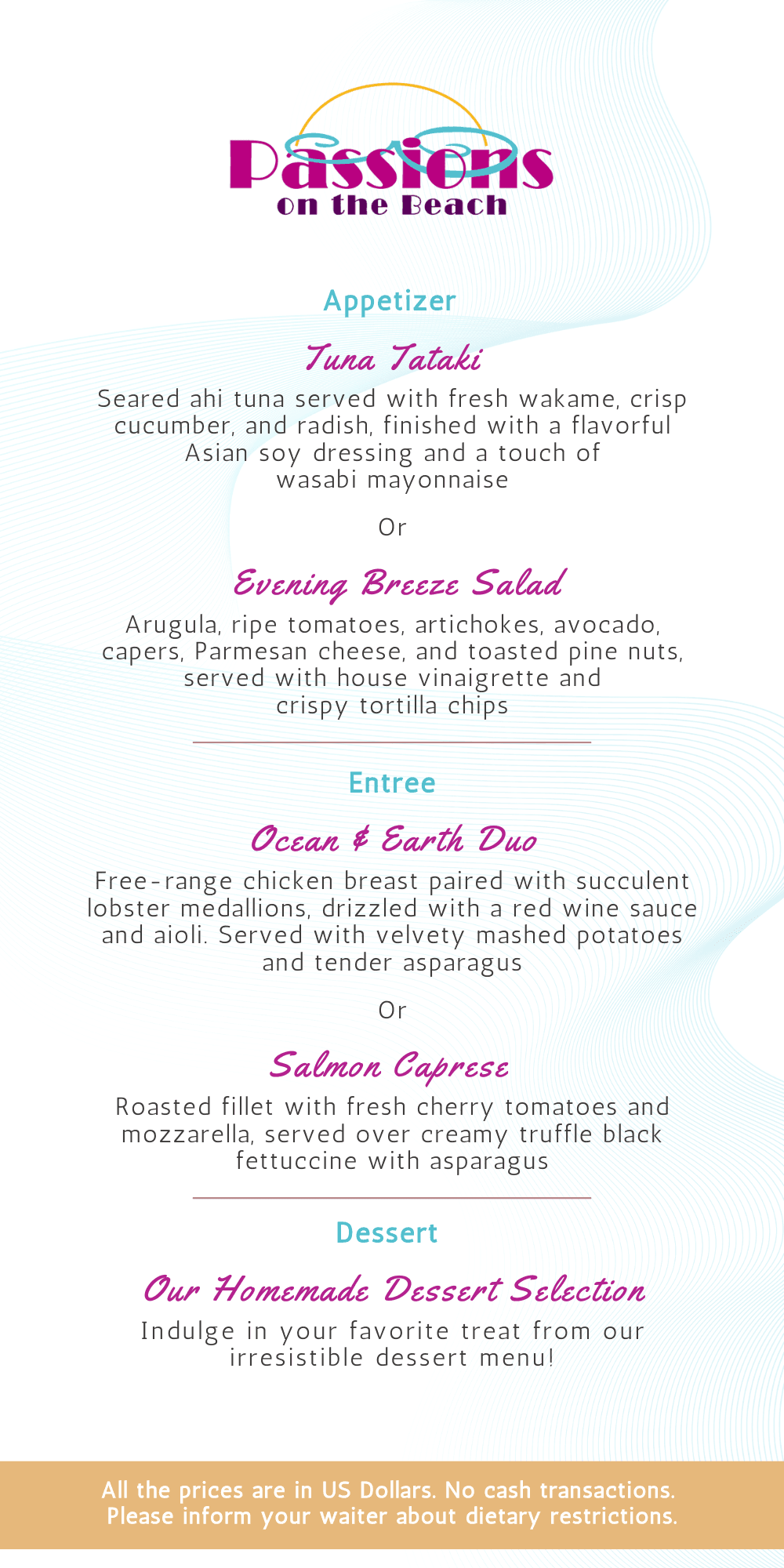This limited-time menu features beautifully crafted dishes such as Tuna Tataki, Ocean & Earth Duo, and Salmon Caprese, followed by our irresistible Homemade Dessert Selection. Each course is designed to bring together taste, texture, and elegance in every bite.